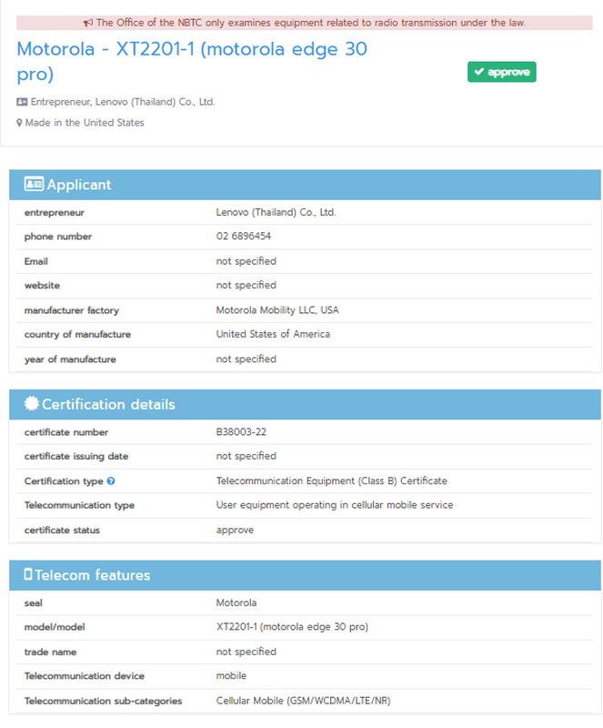 Das Gerät wurde bereits vom Indian Bureau zertifiziert NBTC. In den Dokumenten ist das Gerät mit der Modellnummer XT2201-1 und interessanterweise mit einem anderen Namen - Moto Edge 30 Pro - aufgeführt. Dies ist höchstwahrscheinlich der Name, den das Smartphone auf dem Weltmarkt haben wird. Die Veröffentlichung der Neuheit soll in Kürze erfolgen.