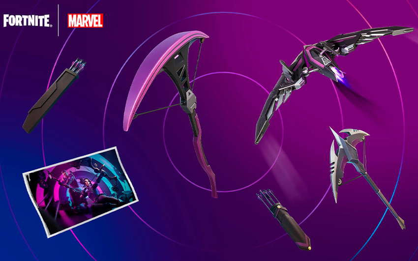 Spieler können Ausrüstung (plus Rückendekorationen), Spitzhacken und einen Hängegleiter einzeln oder als Teil eines Hawkeye-Sets kaufen. Dieses Paket enthält auch den Ladebildschirm von Falcon Band.