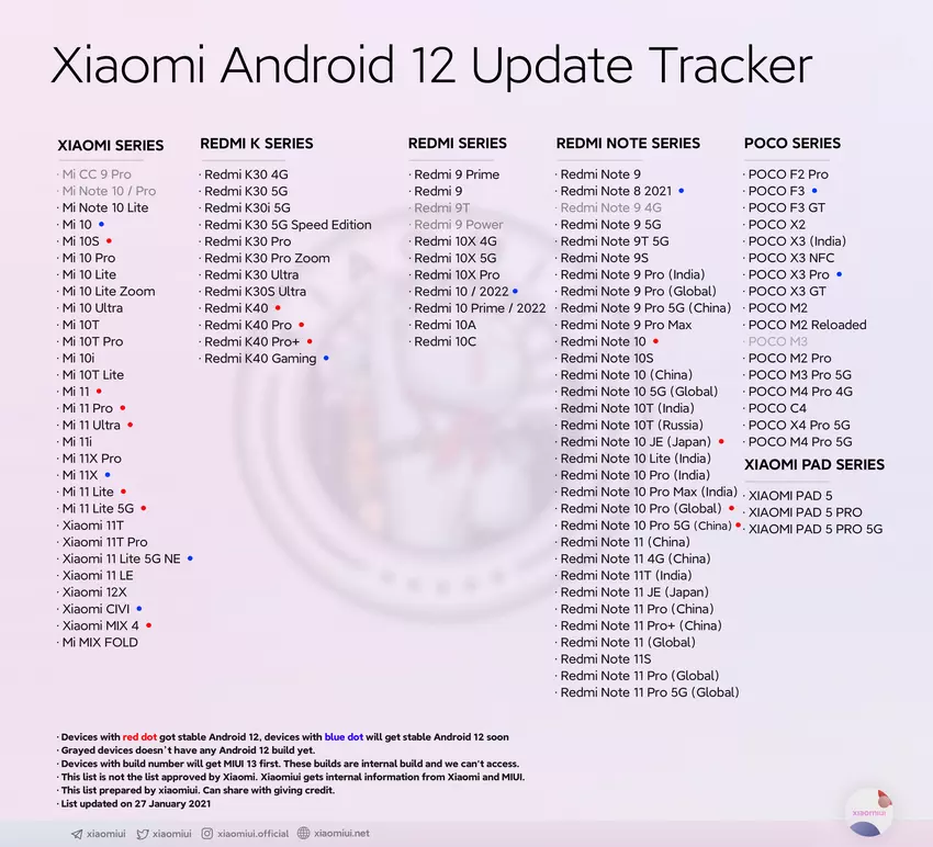 xiaomiui hat eine Liste mit 100 Smartphones veröffentlicht, die das Betriebssystem Android 12 erhalten oder bereits erhalten haben und zusammen mit der Firmware MIUI 13 verschickt werden.