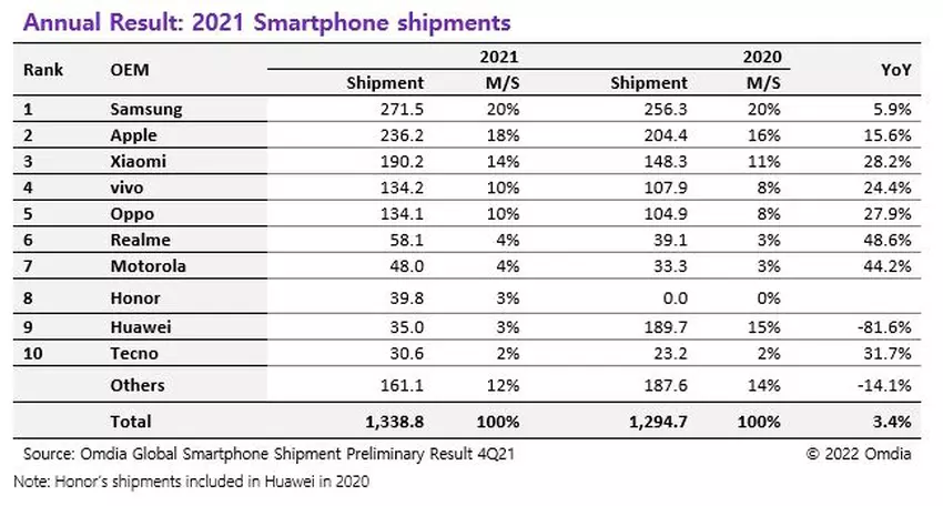 Am Ende des Jahres ist Huawei immer noch in den Top Ten. Im Vergleich zu 2020 gingen die Auslieferungen um 81,6 % zurück. Das Unternehmen wurde von Motorola (4 %) und Honor (3 %) überholt, liegt aber immer noch vor Tecno (2 %). Die Gesamtlieferungen von Smartphones für das Jahr beliefen sich auf 1,3388 Milliarden Einheiten (+3,4 %).