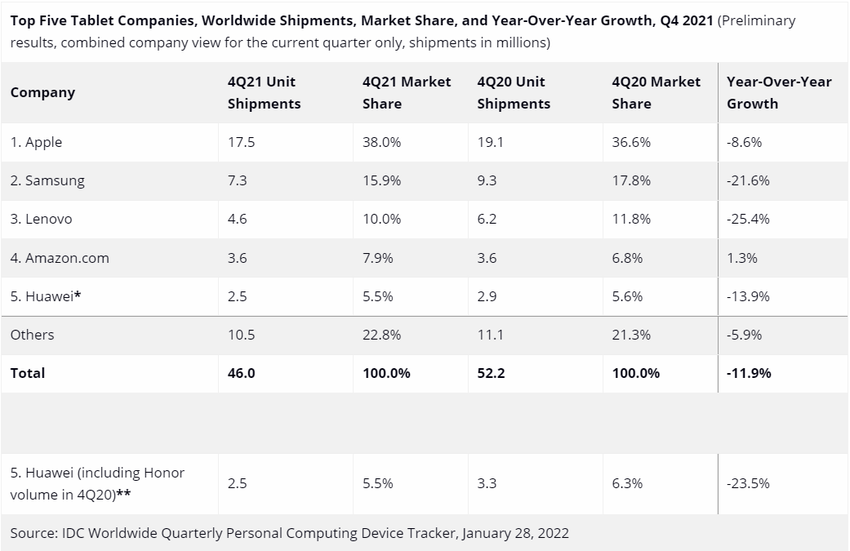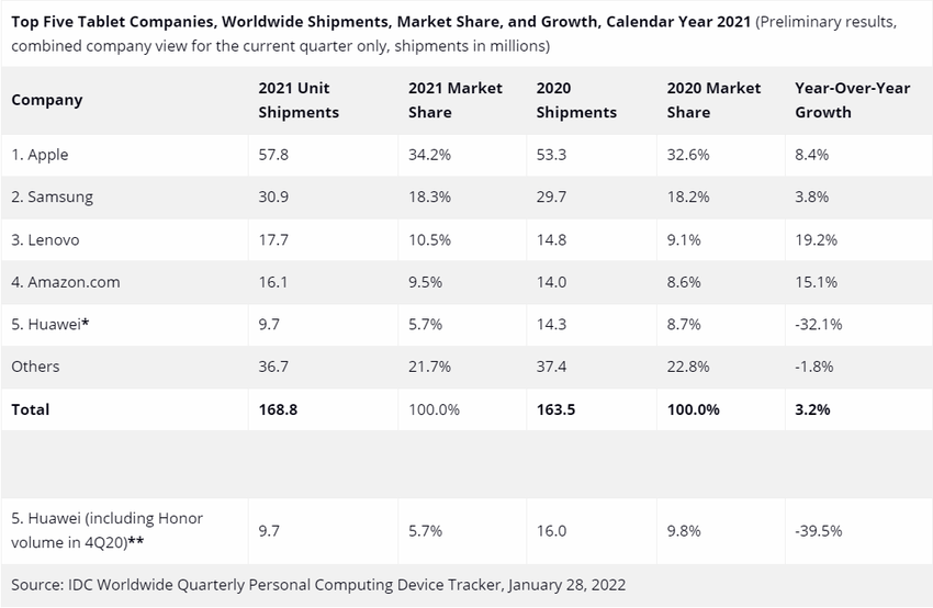 Apple führte den Tablet-Markt 2021 souverän an – Lenovo war unter den Top 3, während Huawei und Amazon unter den Top 5 waren