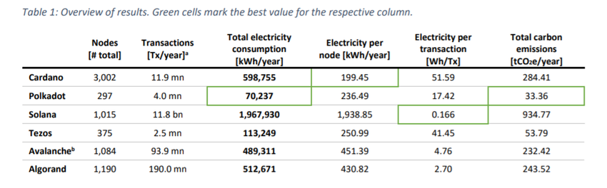 Das Crypto Carbon Rating Institute hat den Energieverbrauch und den CO2-Fußabdruck mehrerer Protokolle analysiert, die auf dem Proof-of-Stake-Algorithmus laufen. Wie sich herausstellte, hinterlässt das Polkadot-Blockchain-Protokoll den kleinsten CO2-Fußabdruck in der Atmosphäre.