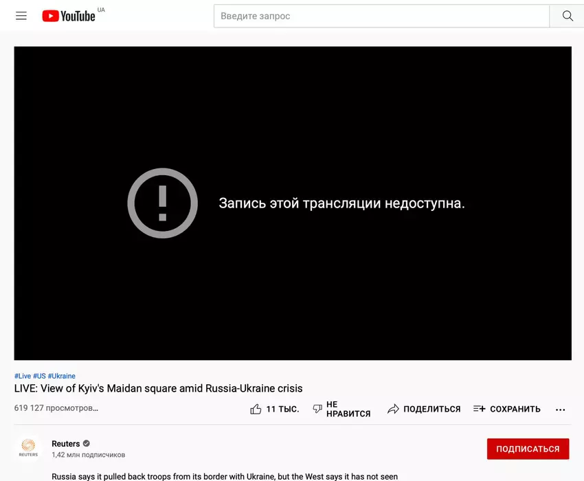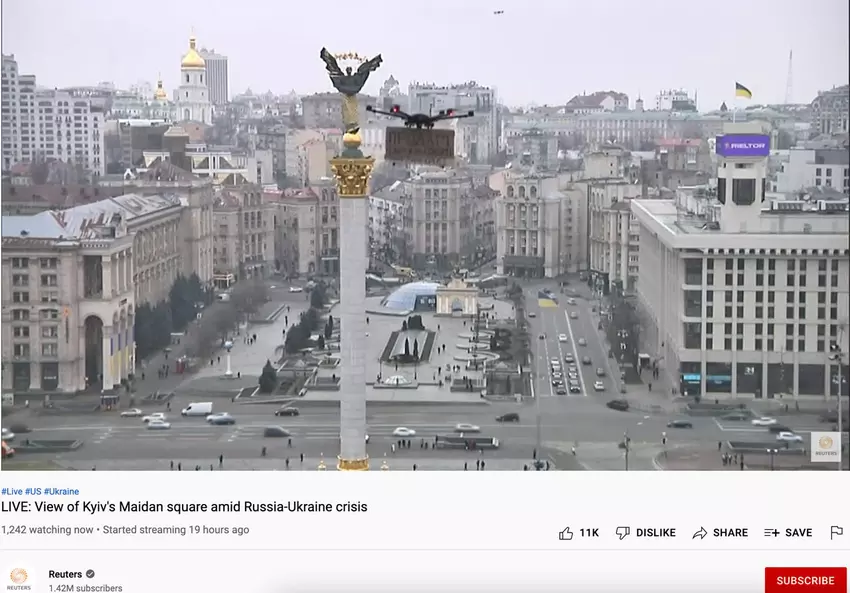 informativ Agentur Am 15. Februar startete Reuters eine Sendung aus dem Zentrum von Kiew mit dem Titel „Blick auf den Maidan-Platz in Kiew vor dem Hintergrund der russisch-ukrainischen Krise“. Nach fast einem Tag kam eine Drohne mit Werbung ins Bild.