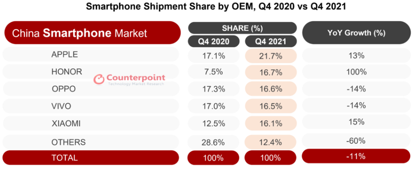 Honor hatte trotz eines Rückgangs von insgesamt 11 Prozent ein starkes Ende des Jahres 2021 auf dem Heimatmarkt. Nach den Ergebnissen des vierten Quartals belegte es den zweiten Platz in der Liste der größten Anbieter von Smartphones.