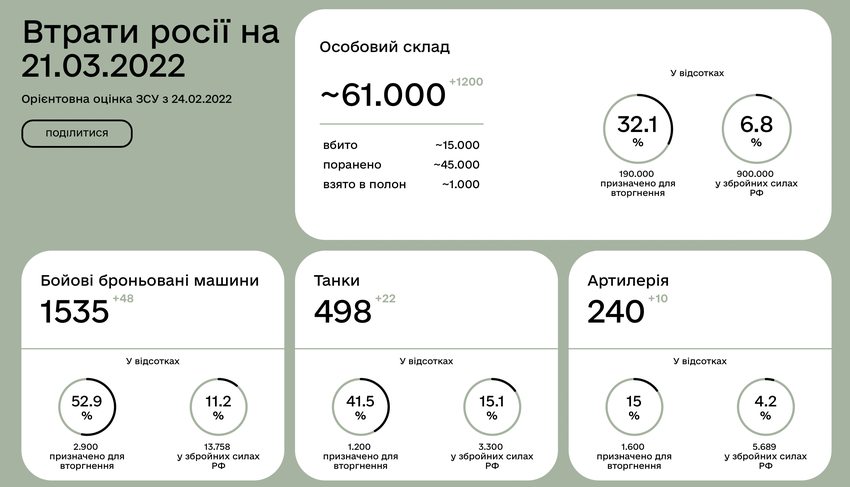 Freiwillige haben Websites ins Leben gerufen uawar Und minus, wo Sie die aktuellen Statistiken der feindlichen Verluste einsehen können. Die Seiten haben verschiedene Sprachversionen und werden ständig aktualisiert. Informationen stammen aus offiziellen Quellen.