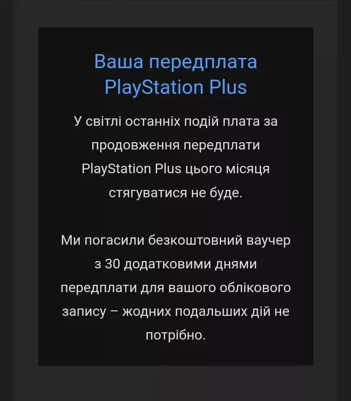 Außerdem sind PlayStation Plus-Abonnements für die nächsten 30 Tage für Benutzer aus der Ukraine kostenlos, aber das Angebot gilt für diejenigen, die es bereits im letzten Monat unterzeichnet haben.