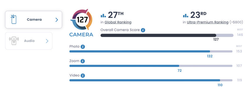 Das Gerät erhielt 127 Punkte und belegte den 27. Platz im Ranking. Das heißt gem DxOMark, das Gerät schießt schlechter als das Xiaomi Mi 10 Pro, Xiaomi Mi 11 Pro, Vivo X60 Pro+ und iPhone 12 Pro. Alle diese Geräte kamen vor mehr als einem Jahr heraus.