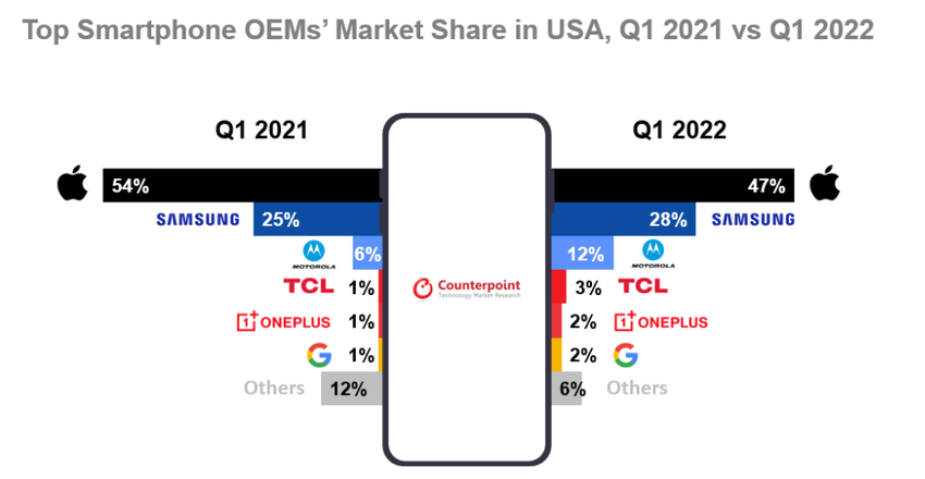 Auch in den Top 5 enthalten TCL, Ein Plus und Google. Ihre Anteile betrugen 3 %, 2 % bzw. 2 % gegenüber 1 % im ersten Quartal 2021. Letzteres steigerte übrigens die Sendungen um 152 %. Alle anderen Hersteller lieferten insgesamt 6 % der Smartphones auf den amerikanischen Markt (es waren 12 %).