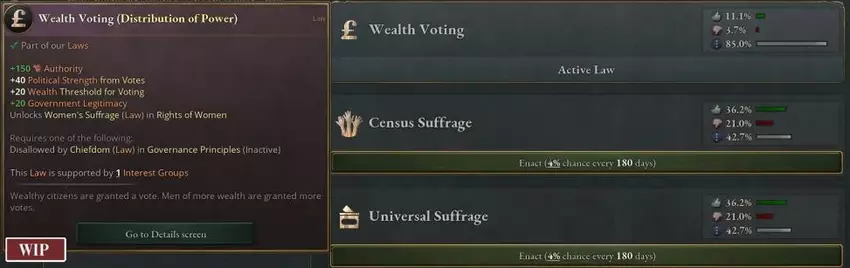 Aristokraten, Kapitalisten, Priester und Offiziere haben fast die vollständige Kontrolle über Wahlen und erhalten einen riesigen Bonus auf die politische Macht, die sie an politische Gruppen weitergeben.