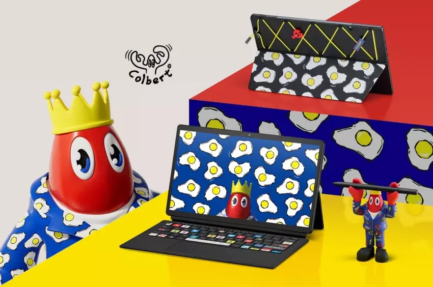 Colberts Pop-Art ist oft mit solchen Tieren gefüllt, manchmal in seltsamen Posen oder Kleidung. Die Hinzufügung von leuchtenden Farben, Mustern und Objekten, die fast unorganisiert verstreut sind, lässt seine Kunstwerke fast surreal wirken, als wären sie direkt aus den Träumen von jemandem stammen. Diesen Eindruck vermittelt die Philip Colbert Edition des Vivobook 13 Slate, insbesondere mit ihrem Material-, Themen- und Eiermix. Und ja, es gibt auch jede Menge Hummer.