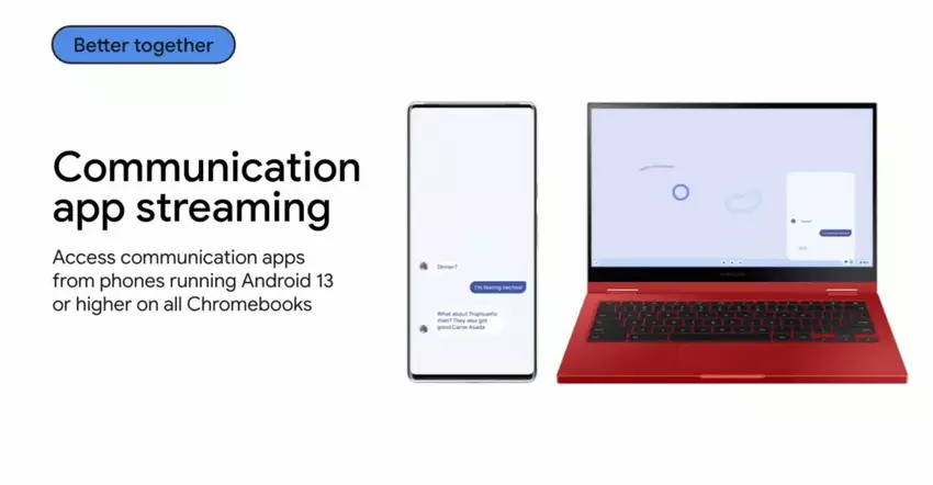 Better Together abschließen bestätigte auch das Streaming von Kommunikationsanwendungen, die Android-Benutzern eine erweiterte Messaging-Oberfläche auf ihrem Chromebook bieten wird. Dazu benötigen Sie ein Gerät mit Android 13 und Chromebook. Die Essenz der Funktion besteht darin, dass Sie das Gespräch von Ihrem Smartphone direkt in Form eines Miniprogramms zu Chrome OS fortsetzen können. Es wird interessant sein zu sehen, wie dies mit den auf Ihrem Chromebook installierten Apps funktioniert und ob es eine nahtlosere Verbindung zwischen Ihrem Laptop und Ihrem Mobilgerät bieten kann.