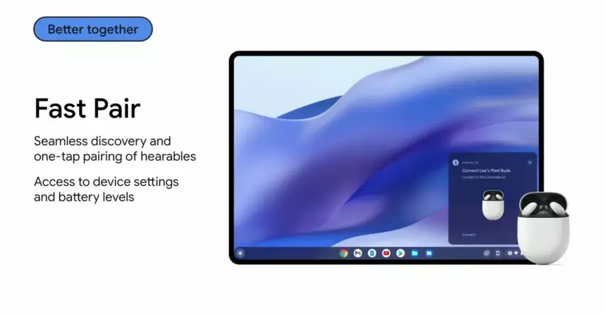 Zuerst bekommen wir endlich Fast Pair für Chrome OS. Mit Fast Pair können Benutzer kompatibles Zubehör mit nur einem Tastendruck kombinieren und Verbindungen zwischen Geräten synchronisieren. Das bedeutet, dass Sie beispielsweise mit Pixel Buds mit nur einer Berührung reibungslos von einem Gerät zum anderen wechseln können.