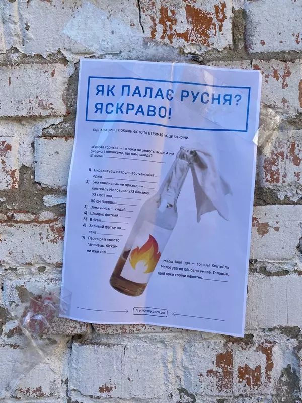 Es gibt sogar eine "Anleitung", wie man Molotow-Cocktails herstellt und damit die Ausrüstung der Eindringlinge verbrennt. Für ein Foto von verbrannter russischer Ausrüstung oder Eindringlingen, die sich jetzt in der Stadt aufhalten, versprechen sie eine Belohnung in Bitcoins.