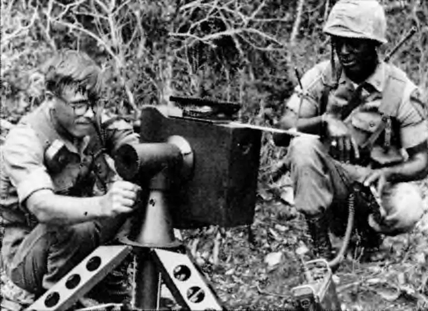 Ein Foto: Bodenlaser-Zielbeleuchtungsstation GLLD (Ground Laser Locator Designator) während der Tests, 1974 (Wikipedia )