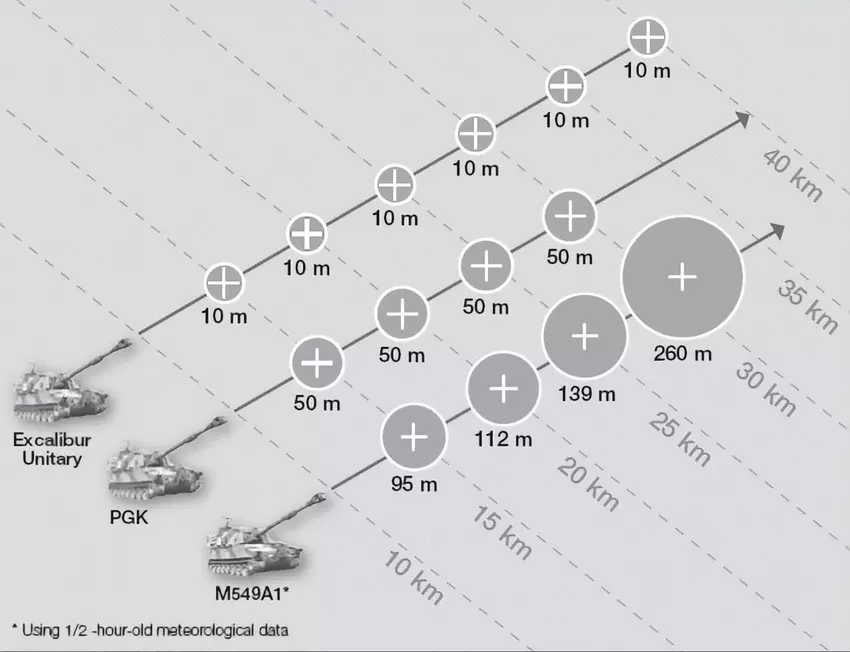 Illustration: Vergleich von KVO beim Abfeuern eines Standard-155-mm-Projektils (mit meteorologischen Daten nicht später als 30 Minuten), eines Projektils mit PGK und eines Excalibur-Projektils (globalsecurity.org )