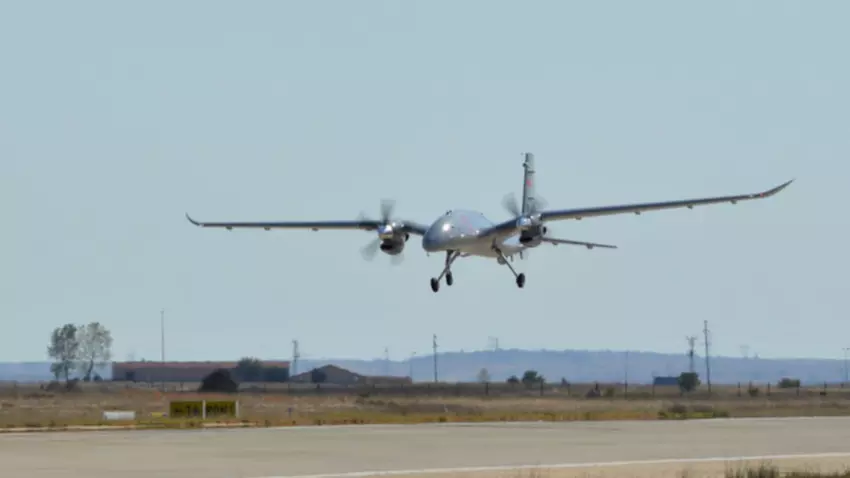 Abrufen Bayraktar AKINCI TIHA hat ein maximales Startgewicht von 6000 kg und kann 24 Stunden in der Luft bleiben. Die Flügelspannweite beträgt 20 m, und die Höhe und Länge der Drohne beträgt 4,1 m bzw. 12,2 m. Er kann eine Last von 1350 kg heben.