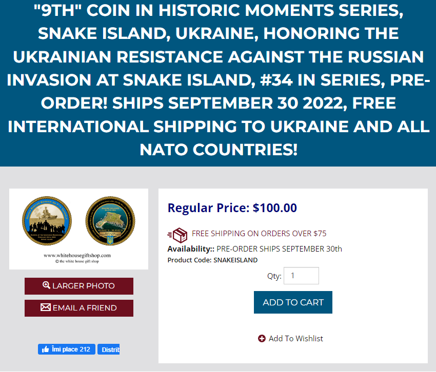 Weißes Haus veröffentlicht Sammlermünze zu Ehren der Verteidiger der Schlangeninsel - kostenlose Lieferung in die Ukraine und in NATO-Länder