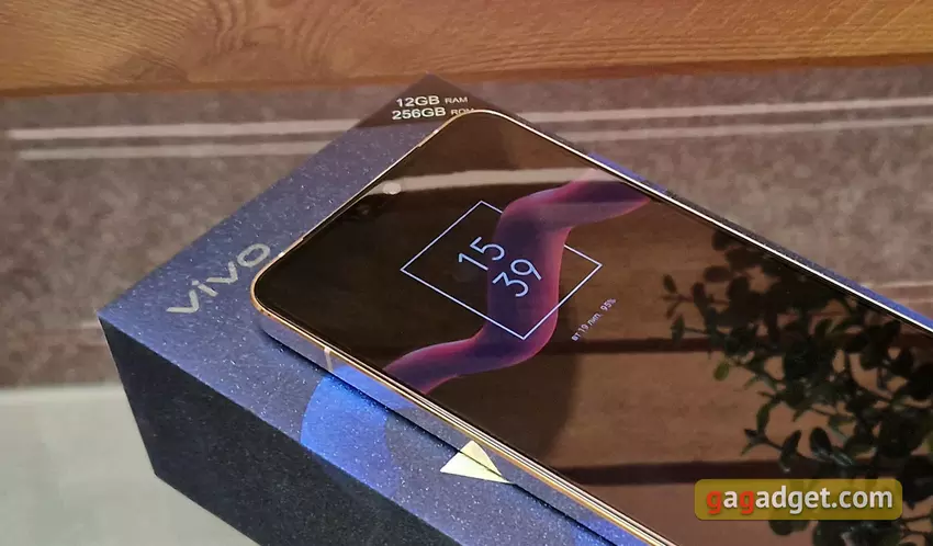 das vivo V23 5G, kann als mittelgroß bezeichnet werden, da Smartphones mit großen Bildschirmen in aller Munde sind. Das Smartphone hat ein Design mit scharfen rechten Winkeln, im Gegensatz zu den meisten modernen Modellen, die einen stromlinienförmigen Rahmen haben. Fast die gesamte Vorderseite wird von einem 6,44-Zoll-AMOLED-Bildschirm eingenommen, der eine nicht ganz alltägliche Aussparung für die Frontkamera aufweist. Erstens ist es breit, weil es zwei Frontkameras hat. Und zweitens hat es die Form einer "Monobraue" und nicht die eines Lochs, wie es heute üblich ist. Darüber befindet sich ein dünnes Lautsprechernetz, das von zwei LEDs flankiert wird, um Selfies bei schlechten Lichtverhältnissen zu beleuchten. Die Rahmen an den Seiten sind dünn, der obere Teil und das "Kinn" sind etwas breiter.