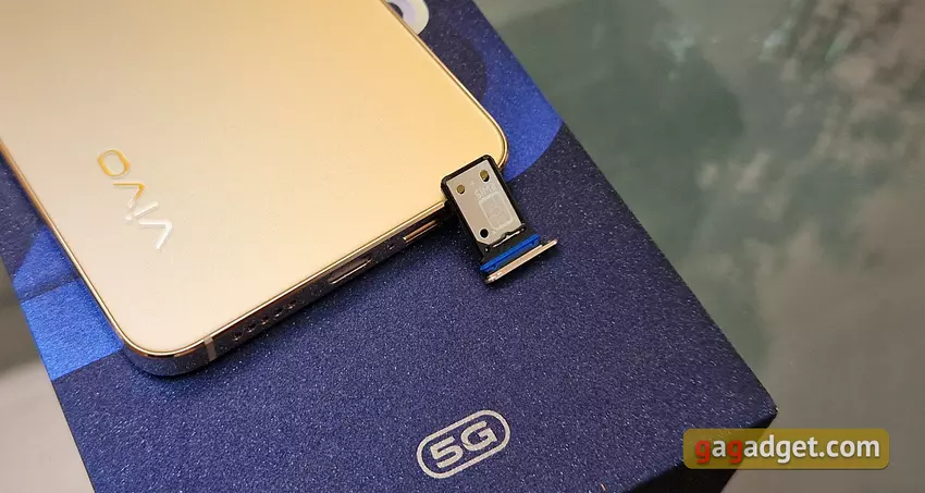 Das Smartphone hat keine Speicherkartenoption, sondern nur zwei Nano-SIM-Karten. Das jüngere vivo V23e hat die Möglichkeit, eine MicroSD-Karte anstelle einer zweiten SIM-Karte zu installieren. Interessant ist, dass das Fach eine Gummidichtung hat, obwohl vivo V23 5G keinen Feuchtigkeitsschutz hat.
