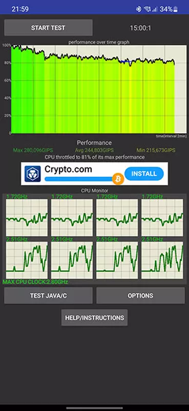 Der CPU Throttling Test hat gezeigt, dass die Leistung des vivo V23 5G bei längerer maximaler Belastung auf durchschnittlich 84% sinkt, was durchaus normal und akzeptabel ist. Gleichzeitig ist das Gehäuse fast ungeladen.