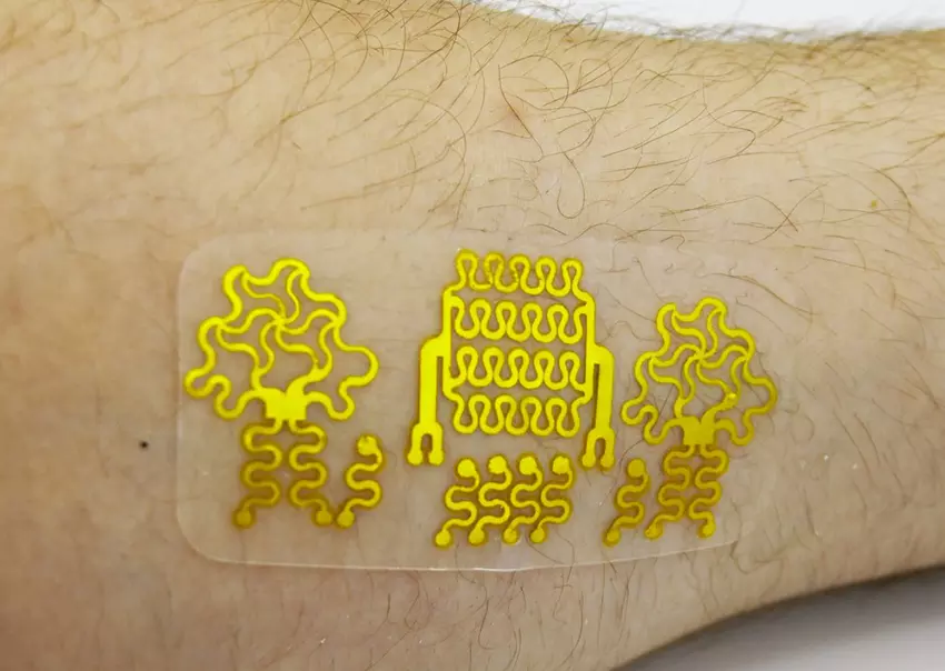 Sowohl die Goldfolie als auch das Klebeband wurden dann in flexible Schaltkreise geschnitten, die mit einer handelsüblichen Cricut-Stoffschneidemaschine (die üblicherweise von Bastlern verwendet wird) wiederholt auf die Haut einer Person aufgebracht und von ihr entfernt werden können. Diese Biosensoren können in Kombination mit anderer Elektronik die elektrische Aktivität von Herz und Muskeln sowie den Laktose-, Glukose-, pH- und Sauerstoffgehalt messen. Alle Informationen können über Bluetooth an ein Smartphone übertragen werden."