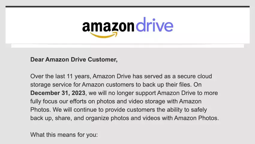 Heute Morgen hat Amazon seine Kunden darüber informiert, dass der Cloud-Speicherdienst "Drive" im Jahr 2023 seinen Betrieb einstellen wird. Im März 2011 führte Amazon einen "sicheren Cloud-Speicherdienst für Amazon-Kunden zur Sicherung ihrer Dateien" ein Kunden erhielten 5 GB kostenlosen Speicherplatz mit Apps für Android, iOS und das Internet.