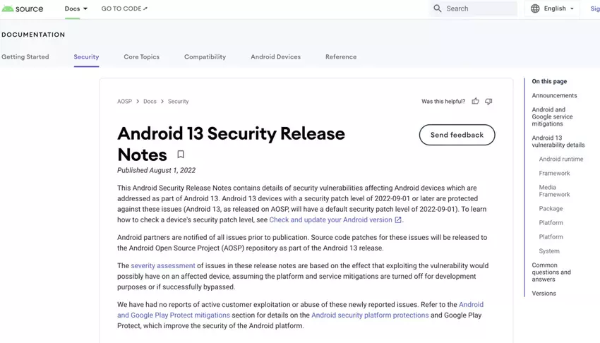 Der Sicherheitspatch 2022-09-01 deutet darauf hin, dass Android 13 im September erscheinen wird, auch wenn es sich nur um das Debüt von AOSP (Android Open Source Project) handeln könnte. Android 13-Geräte mit einem Sicherheitspatch-Level von 2022-09-01 oder höher sind gegen diese Probleme geschützt (Android 13, das über AOSP veröffentlicht wird, hat einen Standard-Sicherheitspatch-Level von 2022-09-01).