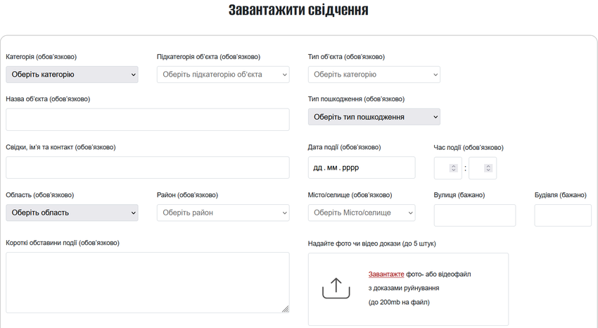 Jeder kann Informationen über die durch die russische Aggression verursachten Zerstörungen und Schäden liefern. Dabei sollten die Art und der Name des Objekts, die Stadt und die Region, in der sich das Objekt befindet, sowie das Datum der Zerstörung angegeben werden. Es ist wichtig, Daten über die Zerstörung von Infrastruktur, großen Verwaltungsobjekten und Hochhäusern zu sammeln: Brücken, Flughäfen, Schulen, Krankenhäuser. Dazu müssen Sie ein spezielles Formular auf der Website ausfüllen.