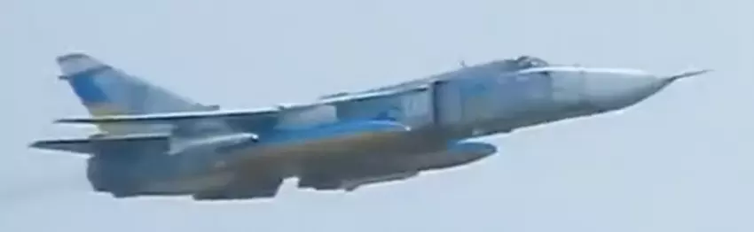Hier können wir die blauen und gelben Streifen im Stil der ukrainischen Flagge erkennen. Das deutet darauf hin, dass es sich um ein ukrainisches Flugzeug handelt, denn der Frontbomber ist auch bei der russischen Armee im Einsatz.