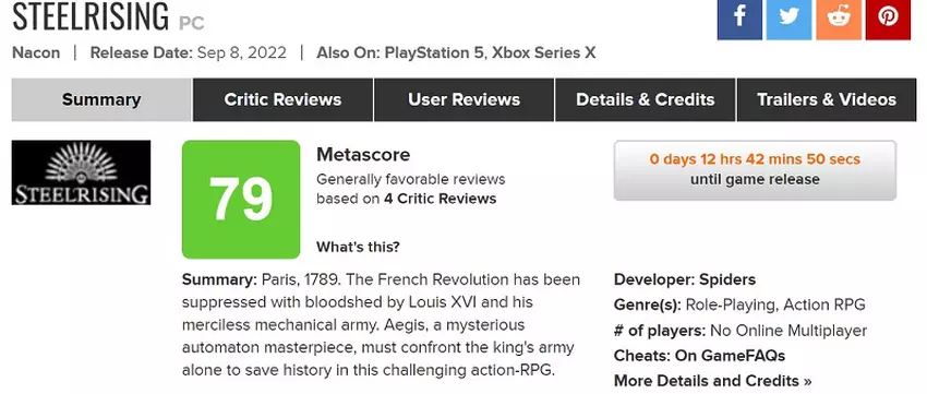 Das Spiel hat nicht die höchsten Bewertungen erhalten. Auf Metacritic wurde die PC-Version mit 79 Punkten bewertet (4 Bewertungen), und die Konsolenversion erhielt sogar noch weniger: auf der PS5 erhielt Steelrising 71 Punkte, und auf der Xbox-Serie - 72 Punkte.