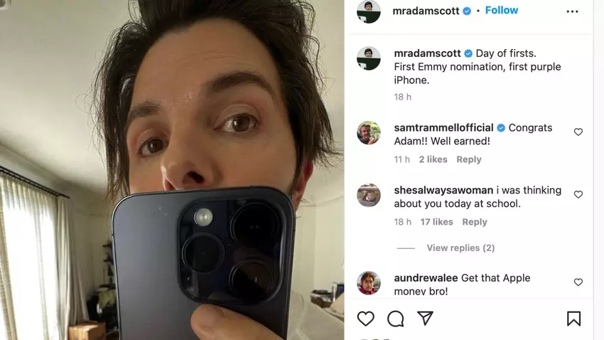 "Tag 1. Erste Emmy-Nominierung, erstes lila iPhone", schrieb Adam.