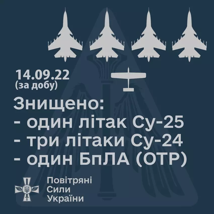 Am 14. September schossen die ukrainischen Luftverteidigungskräfte vier Flugzeuge und ein einsatzfähiges unbemanntes Luftfahrzeug ab. Das Modell der Drohne ist nicht bekannt, aber höchstwahrscheinlich handelte es sich um eine weitere Orlan. Zu den Flugzeugen gibt es einige Informationen.