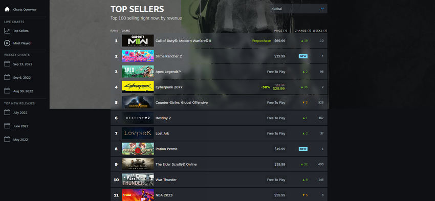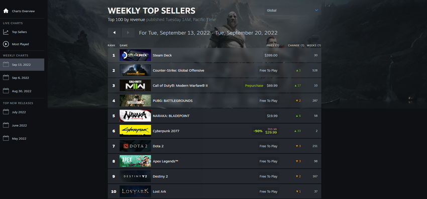 Jetzt kannst du die meistverkauften Spiele in Echtzeit sehen. Die Listen zeigen auch an, wie viele Wochen das Spiel bereits auf der Liste steht, Informationen darüber, um wie viele Positionen das Spiel auf- oder abgestiegen ist, den Preis und die Möglichkeit, die Rangliste weltweit und in einzelnen Ländern zu sehen.