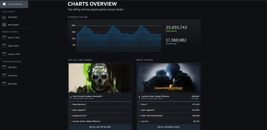 Valve hat neue Steam-Listen eingeführt, in denen man die Bewertung der beliebtesten Spiele auf der Plattform ablesen kann. Jetzt gibt es Echtzeit-Listen mit Hits und den beliebtesten Spielen der Woche, des Monats und aller Zeiten. Außerdem gibt es eine Rangliste der Spieleverkäufe und die erfolgreichsten Veröffentlichungen des Monats.