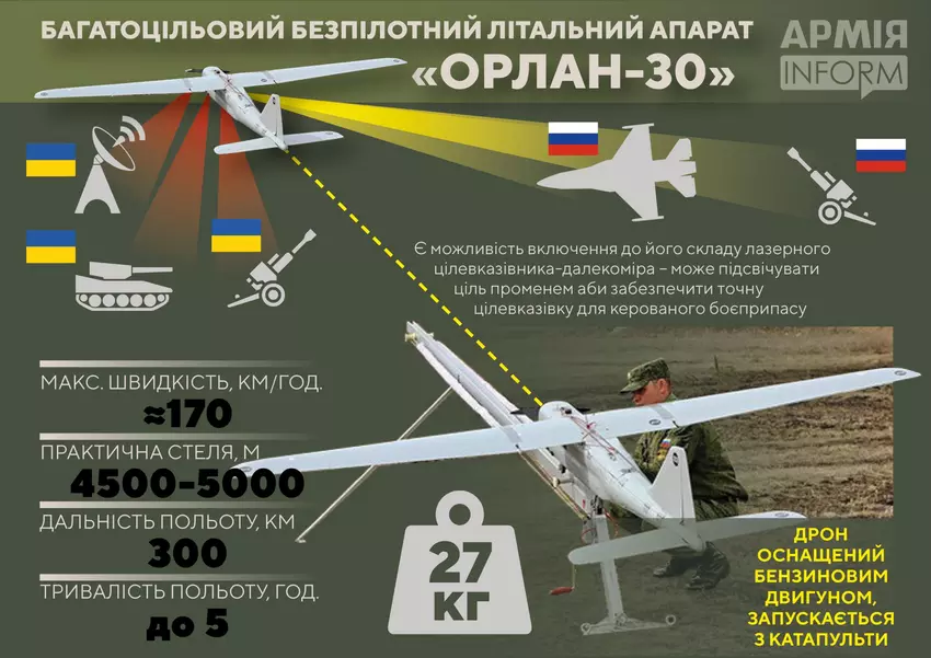 "Orlan-30" kann 5 Stunden lang fliegen. Sie hat eine Reichweite von 300 km und eine Reichweite von 150 km. Die Drohne kann auf eine Höhe von bis zu 5.000 m steigen und eine Geschwindigkeit von bis zu 170 km/h erreichen. Zum Vergleich: Die Höchstgeschwindigkeit der Orlan-10 liegt bei 150 km/h, die Reichweite bei 120 km.