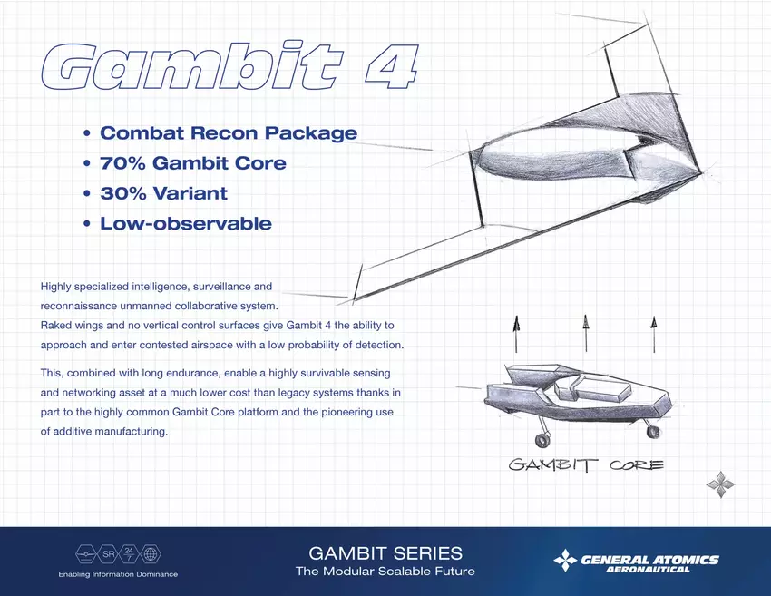 Das amerikanische Unternehmen General Atomics Aeronautical Systems kündigte eine Reihe von modularen Drohnen Gambit für den Einsatz mit bemannten Flugzeugen an.