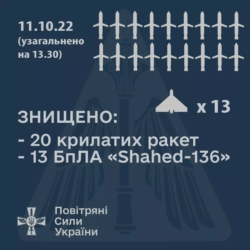 Die Gesamtzahl der abgeschossenen Drohnen ist weitaus höher: Nach Angaben des Luftwaffenkommandos der AFU wurden bis zum 11. Oktober um 13:30 Uhr bereits 20 Marschflugkörper und 13 Shahed-136-Drohnen abgeschossen.