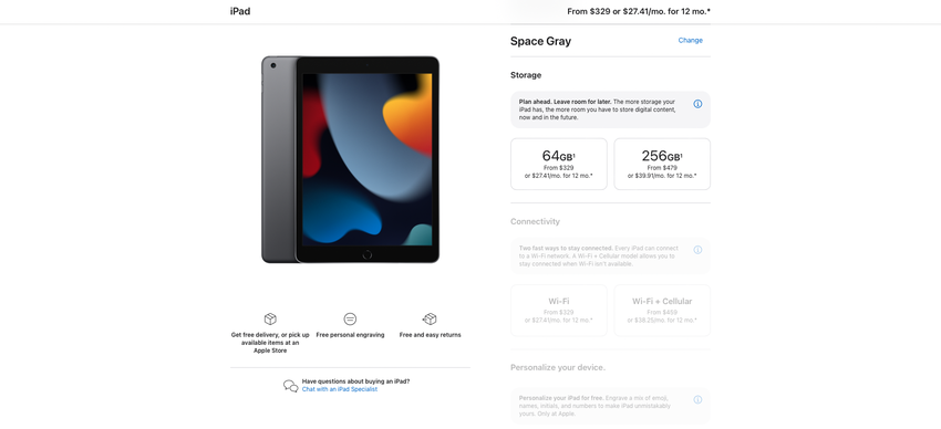 Das iPad der 9. Generation ist immer noch auf der offiziellen Website des Unternehmens erhältlich, und der Preis des Geräts wurde nicht gesenkt. Das Tablet wird in zwei Speichermodifikationen verkauft: die Basisversion mit 64 GB kostet 329 $, die Topversion mit 256 GB - 478 $.