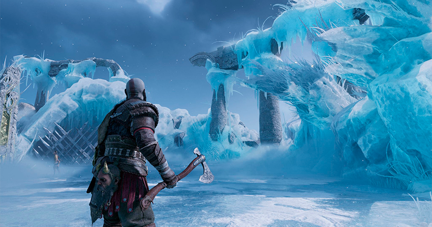 Auf dem Foto ist zu sehen, wie Kratos und sein Sohn Atreus durch die Neun Reiche reisen. Die Bilder zeigen das schneebedeckte Midgard, Alfheim, Muspelheim und andere Welten.