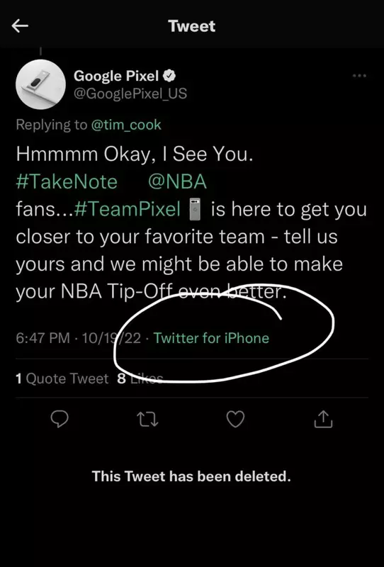 Google-Mitarbeiter hinterließen einen Kommentar unter Cooks Twitter-Post, in dem es um die neuen iPad Pro-Tablets mit M2-Prozessor ging. Sie beschlossen, die neuesten Pixel- und NBA-Modelle auf diese Weise zu bewerben. Allerdings verriet ihnen eine kleine Markierung "Twitter for iPhone", was darauf hindeutet, dass die Nachricht im sozialen Netzwerk von einem der Apple-Geräte aus veröffentlicht wurde.