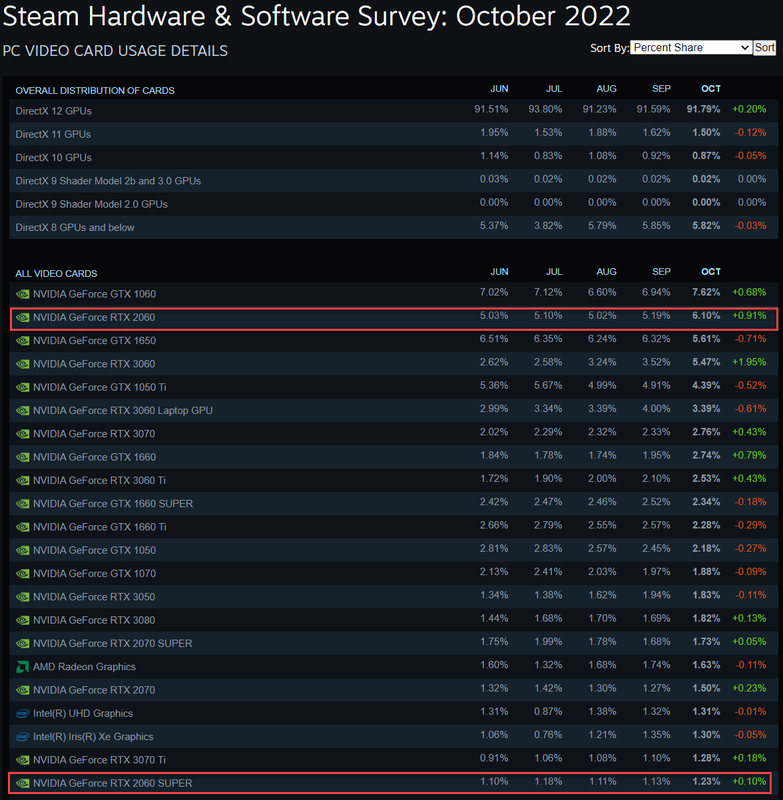 Es sollte angemerkt werden, dass GeForce RTX 2060 sofort eine sehr beliebte Grafikkarte unter den Spielern wurde. Laut Steam-Statistiken, nur GeForce RTX 1060 ist ein beliebter Beschleuniger. Um das gleiche über die RTX 2060 SUPER sagen ist unmöglich, obwohl diese Grafikkarte dank seiner relativ niedrigen Preis ($ 99) fand auch seine Kunden, gewinnen Steam Anteil von 1,23%