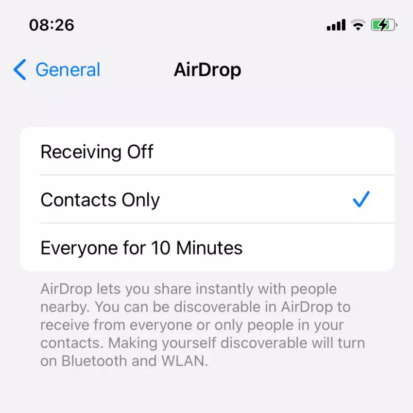 Die Zeit, in der Benutzer Dateien von beliebigen Personen empfangen können, wurde auf 10 Minuten begrenzt. Nach dieser Zeit kehrt das System in den Modus zurück, in dem man Dateien nur von Kontakten empfangen kann.