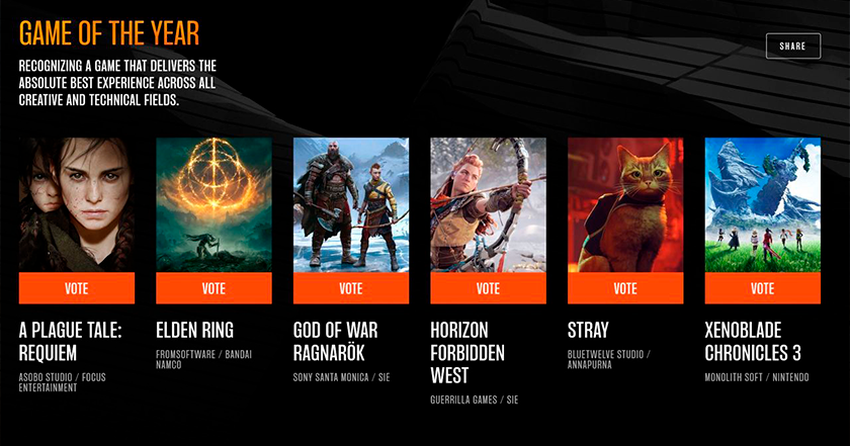 Die Spieler werden den Gewinner wählen. Dazu müssen Sie sich auf der Website von The Game Awards einloggen und für das Ihrer Meinung nach beste Spiel des Jahres 2022 stimmen. Du kannst dies tun, indem du diesem Link folgst.