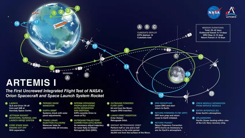 Die Orion wird mit ihrer zweiten Stufe ein vorher festgelegtes Ziel erreichen und dann allein zum Mond aufbrechen. Die Reise wird 25,5 Tage dauern. Während dieser Zeit wird das Raumschiff den natürlichen Erdtrabanten umrunden und am 11. Dezember 2022 zum Planeten zurückkehren.