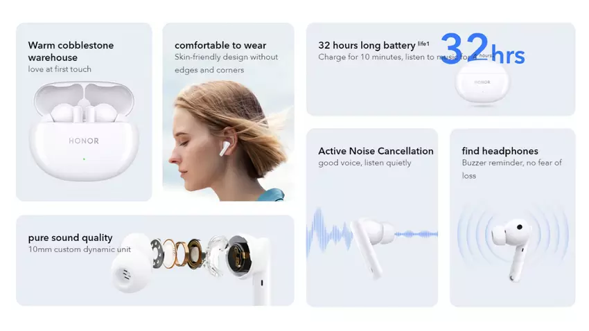 Das Modell wurde Honor Earbuds 3i genannt. Die Ohrstöpsel verfügen über ein Vakuumdesign, einen Ohrerkennungssensor und ein Bluetooth 5.2 Modul. Die Neuheit verfügt über einen anpassbaren Equalizer und ein aktives Geräuschunterdrückungssystem. Es dämpft Geräusche bis zu 32 dB. Die Autonomie soll bis zu 32 Stunden betragen (mit Hülle). Das Gehäuse wird über einen USB-C-Anschluss aufgeladen. Die Kopfhörer werden über Touchpanels gesteuert und können über eine proprietäre Anwendung konfiguriert werden.