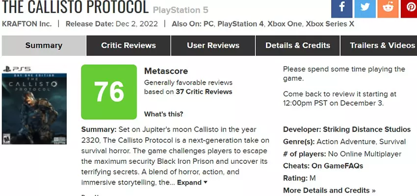 Am Tag der Veröffentlichung von The Callisto Protocol begannen die ersten Kritiken und Bewertungen des Spiels auf den Aggregatoren zu erscheinen.