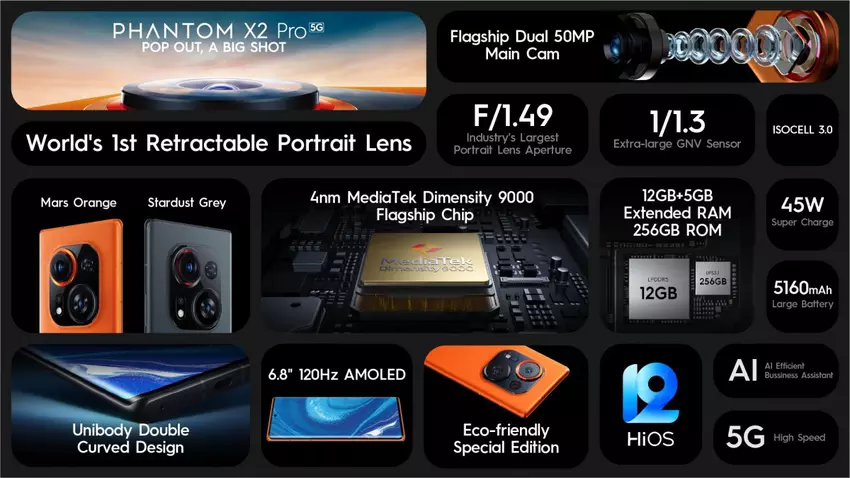 Tecno hat in einer Präsentation das Phantom X2 Pro Smartphone vorgestellt, das als erstes Smartphone der Welt über ein ausfahrbares Portraitobjektiv verfügt.