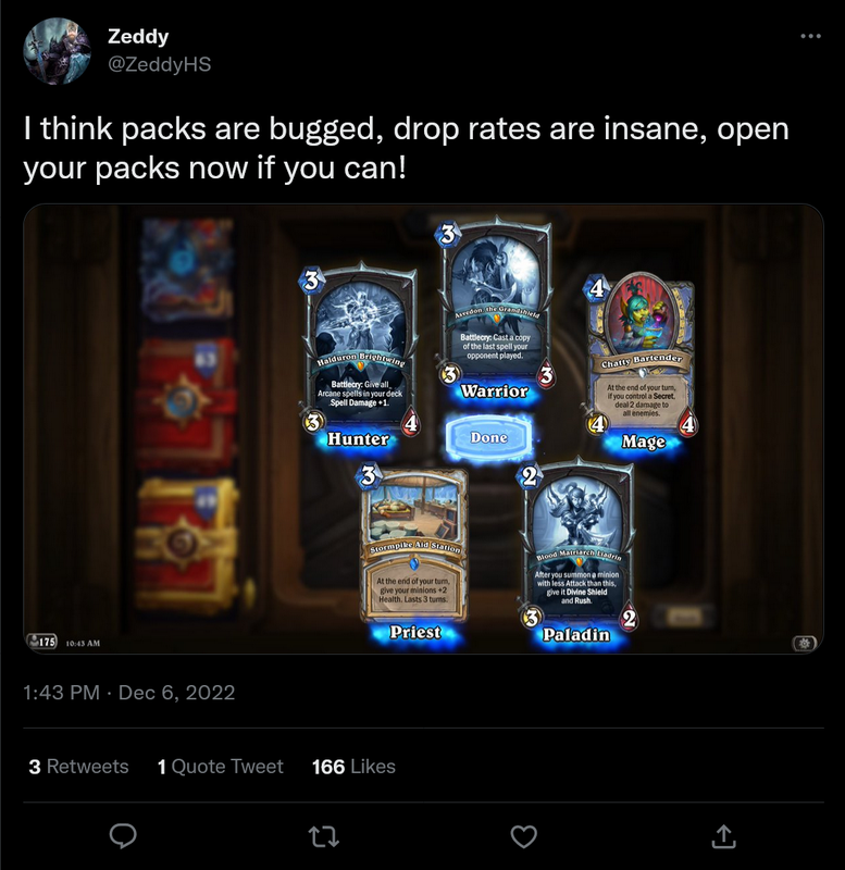 Kurz nach dieser Belohnung stellten Spieler fest, dass sie keine Standard- oder Klassenpakete mehr öffnen konnten, was zu zahlreichen Beschwerden in den Hearthstone-Foren und im Subreddit führte. Wenig später veröffentlichte Blizzard ein offizielles Statement zu dieser Angelegenheit: "Wir deaktivieren vorübergehend das Öffnen von Paketen für Standard- und Klassenpakete, während wir ein mögliches Problem mit diesen Paketen untersuchen."