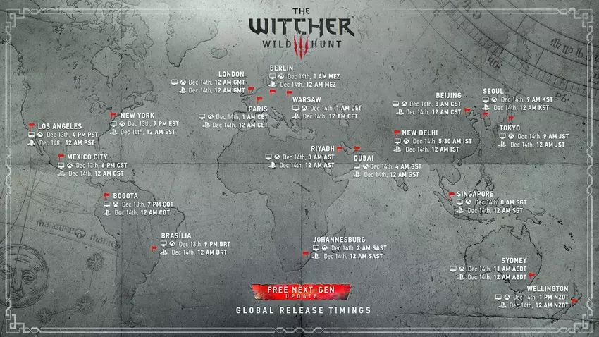 Das polnische Studio CD Projekt Red hat sich um die Fans der The Witcher-Franchise gekümmert und eine übersichtliche Karte veröffentlicht, die die Veröffentlichungszeit der nicht-xtgen Version von The Witcher 3: Wild Hunt in verschiedenen Zeitzonen anzeigt.