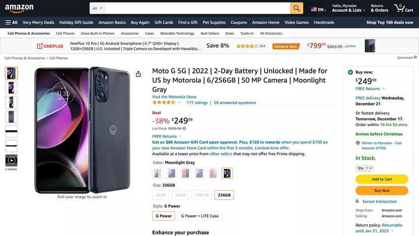 Das Moto G 5G (2022) mit MediaTek Dimensity 700-Chip und 256 GB Speicherplatz ist bei Amazon für $150 weniger erhältlich.